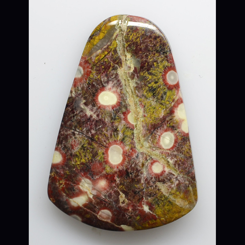 Varieta’ di diaspro orbiculare ormai divenuto raro in quanto la zone di scavo è stata lottizzata per l’edilizia. I colori predominanti sono il rosso e giallo, mentre l’associazione di rosso e nero risulta la piu’ rara.