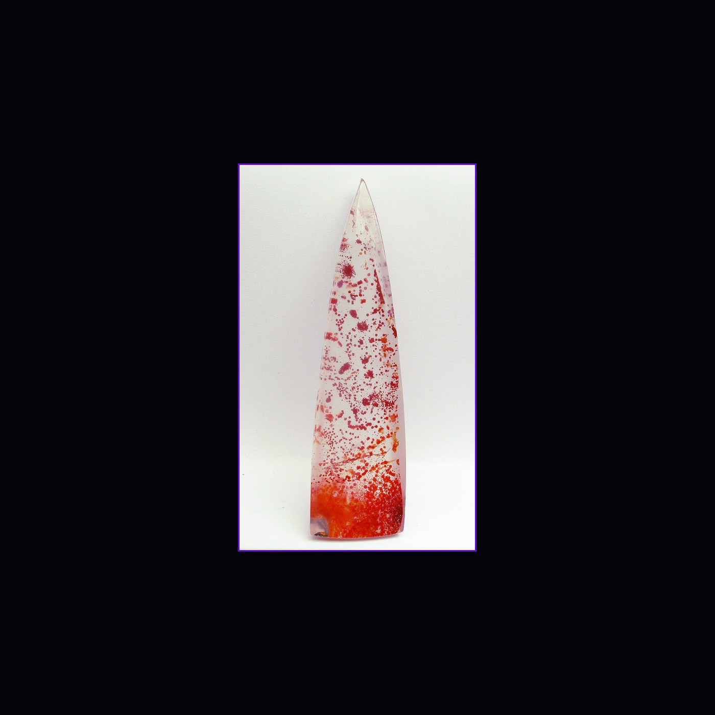 Quarzo ematoide. Questo tipo di quarzo presente delle fratture riempite successivamente alla formazione da ossidi di ferro ,limonite, ematite in genere di un bel colore rosso e giallo,il nero è dovuto a ossidi di manganese.Padiglione tronco. Dal Brasile. Misura:63.6x17.1x9 mm. Peso: 71.75 ct. CODE# 2153